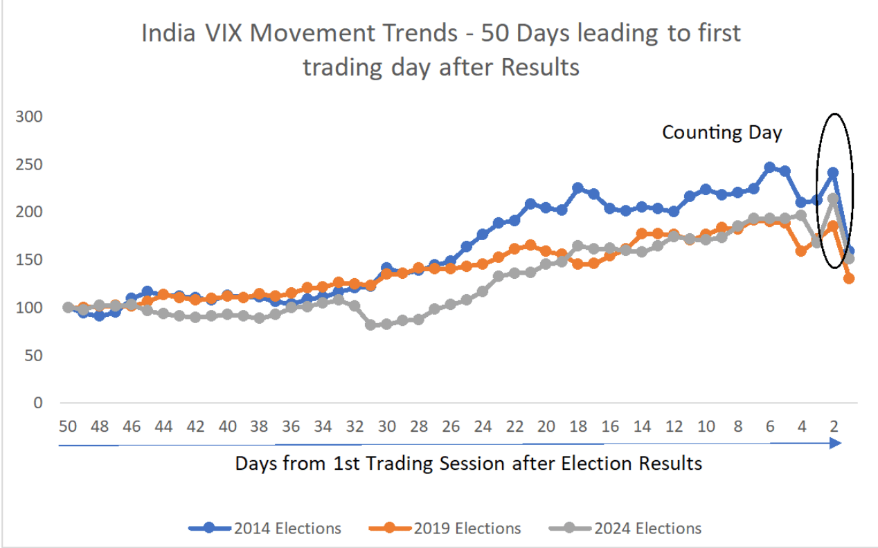 In 2024, VIX followed a similar trajectory rising from around 10 in 2nd week of March 2024 to around 25 on the last day of polling. Nifty 50 oscillated between a wide range of 21300 - 23500 (10% band) while scaling 4 new all-time highs during the volatile phase until result day.
